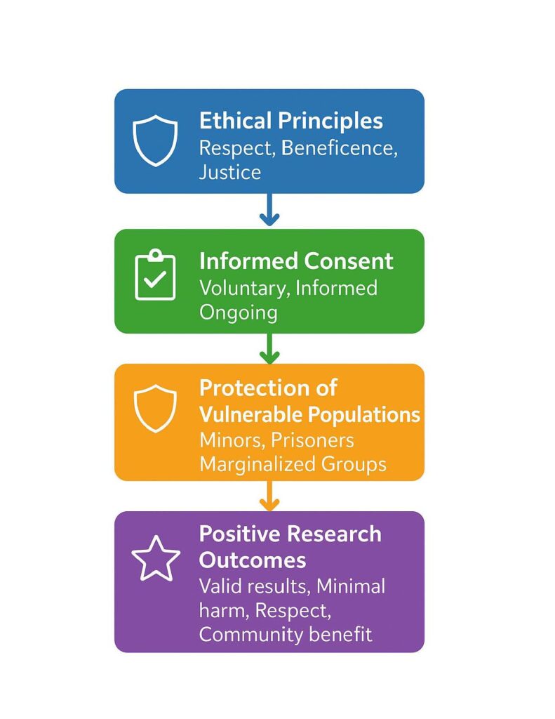Ethical research is grounded in core principles such as respect for persons, beneficence, and justice, which guide all aspects of study design and conduct. These principles underpin the process of informed consent, ensuring that participants receive complete information, understand potential risks and benefits, and voluntarily agree to take part in the research. Special attention is given to vulnerable populations, such as children, prisoners, pregnant individuals, or those with cognitive impairments, to provide additional safeguards and prevent exploitation. When ethics are rigorously applied, research produces credible outcomes, ethically obtained and socially responsible, while protecting participant safety and maintaining public trust in the research process.